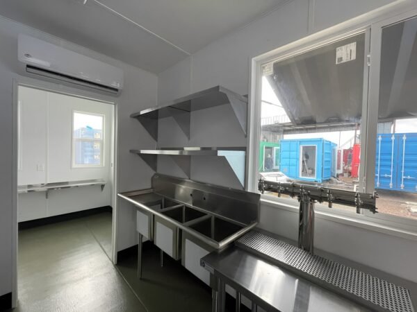 40ft Shipping Container Bar Exterior (Container): 40 ft (L) × 8 ft (W) × 9 ft 6 in (H) – New HC Unit Keg Room: 8.475 ft (L) × 8 ft (W) × 9.5 ft (H) Serving Area: 23.55 ft (L) × 8 ft (W) × 9.5 ft (H) Ticket Counter Room: 5.875 ft (L) × 8 ft (W) × 9.5 ft (H)