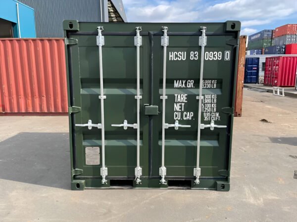 8Ft One Trip Shipping Container (Green) FEATURES NEW – One Trip Only All Cor-Ten Steel construction Exterior hinged double doors at end One locking bars on EACH door Factory fitted lockbox 2 x forklift pockets 28mm Marine Plywood floor on steel cross members Min 2 Vents per container